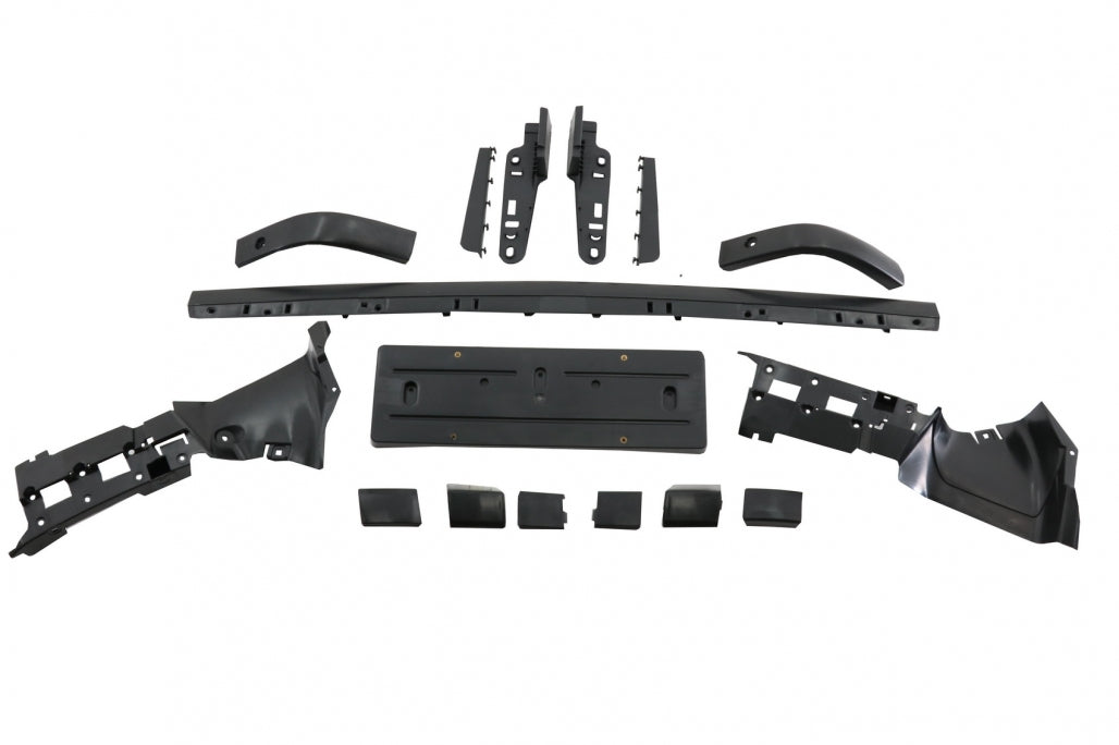 Priekinis bamperis su centrinėmis-apatinėmis grotelėmis ir šoninėmis grotelėmis.